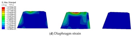 In contrast, Figure 16c,d depict the stress–strain response of the diaphragms in Model SM-6. Compared to the CFSTTs, the diaphragms exhibit pronounced stress concentrations at the junctions with the box beams, with maximum stress values of 3.759 × 102 MPa, surpassing the 325 MPa yield strength of the steel used in the diaphragms of SM-6. Such stress concentrations may indicate potential zones of fatigue damage, warranting design considerations to mitigate long-term performance and safety concerns. Unlike the CFSTTs, the diaphragms’ response in the post-elastic phase could be more susceptible to stress concentration-induced plastic deformation, potentially impacting the structure’s durability. The maximum principal strain plot in Figure 16d elucidates the overall deformation characteristics of the diaphragms during reinforcement, demonstrating their effectiveness in restricting the lateral displacement of the PCB bridge and enhancing the structure’s lateral stiffness. However, this enhancement in stiffness must be balanced against the plastic deformation capacity of the diaphragms in the post-elastic phase to ensure structural reliability under sustained loading.