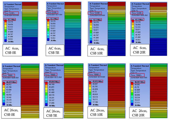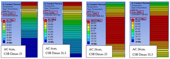 Figure 2 presents the temperature contours within the AC derived from the Ansys simulation when the bottom of the AC reaches its peak temperature. The findings show that CSB Dmax 31.5 leads to a reduced temperature gradient across the depth of the AC. This phenomenon can be attributed to the base’s higher density and greater compactness, which facilitate faster heat transfer. Consequently, heat within the AC dissipates more rapidly into the base, thus lowering the overall AC temperature. This observation is consistent with previous research findings [22,23]. However, the CSB Dmax 25, characterized by a lower density and reduced compactness, retards the heat conduction process towards the base. Hence, the heat dissipation within the AC is slower, resulting in a higher AC temperature. Furthermore, Figure 2 illustrates that, as the AC thickness increases up to 26 cm (hAC = 26 cm), the influence of CSB on the temperature distribution within the AC becomes more pronounced compared to scenarios with thinner ACs (hAC = 6 cm), primarily when CSB Dmax 31.5 is employed. Note that white frame in Figure 2 presents depths of 6 cm and 26 cm, while the red ones indicate the maximum temperature in AC and time at the highest temperature. This observation emphasizes the significance of AC thickness in determining its temperature distribution. Thus, this parameter should be considered in the temperature prediction model developed in Section 4.