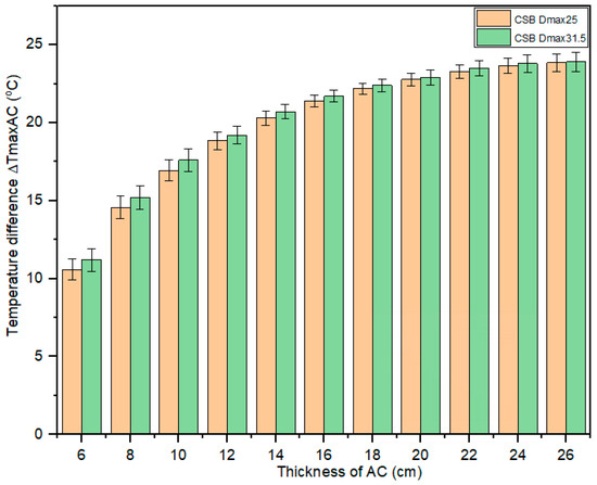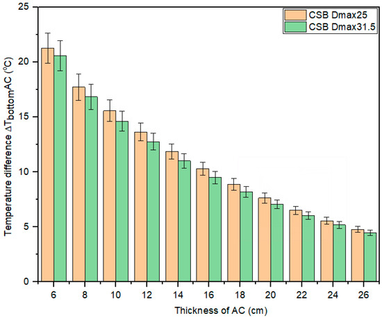 Temperature variation between the bottom and top of AC versus AC thicknesses in two cases of CSB Dmax 25 and CSB Dmax 31.5.