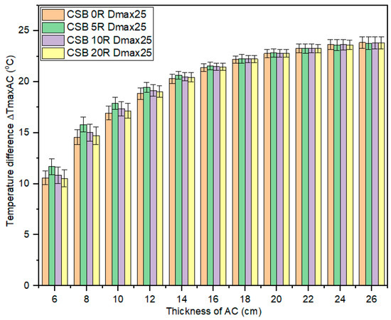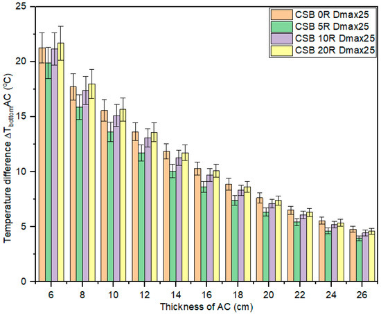 With regard to the incorporation of different RA into the CSB Dmax 25, ∆TbottomAC and ∆TmaxAC were obtained and are illustrated in Figure 6 and Figure 7, respectively. Regardless of the incorporation of RA in CSB, the increasing AC thickness reduced the temperature gradient at the AC bottom (∆TbottomAC) and increased temperature fluctuation in AC (∆TmaxAC). Specifically, the ∆TbottomAC was lowest when CSB 5R Dmax 25 was used for all 11 scenarios of different AC thicknesses. However, the use of CSB 5R Dmax 25 also caused slightly higher ∆TmaxAC, as the AC thickness was less than 12 cm. For thicker AC layers, the gradient was negligible.