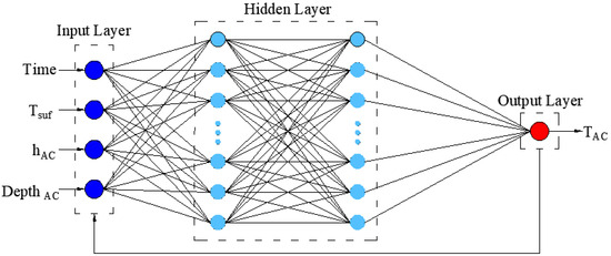 The ANN consists of the input, hidden, and output layers. In this study, as illustrated in Figure 9, the input layer includes the following four parameters: the time of day (Time); surface temperature (Tsuf); AC thickness (hAC); and AC depth (DepthAC). The output layer is a single variable of AC temperature (TAC). Thao et al. [26] showed that a temperature distribution prediction model with two hidden layers resulted in the lowest amount of errors. Therefore, this study also used an ANN structure with two hidden layers; the neuron numbers in each layer varied from 10 to 20. The cascade-forward backpropagation network algorithm and the sigmoid non-linear transfer function were employed [26]. Initially, the output was computed by propagating input data from the input to the hidden layers. Subsequently, the error signal was obtained as the difference between the input and estimated data, which was then backpropagated from the output to the preceding layers to adjust the neural network weights.