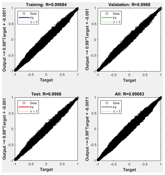 Before the ANN model training, all input and output values were normalized within the [−1, 1] range. Out of the 62.832 temperature observations obtained from the Ansys-based numerical simulations, 70% were allocated for training, 15% for validation, and 15% for testing. Other parameters used for the training included a criterion error of 10−5 and a maximum number of iterations of 1000.