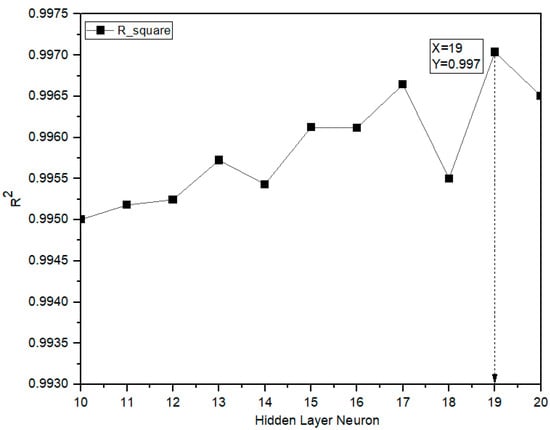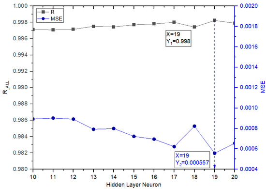The optimized ANN model was selected based on the minor mean squared error (MSE), the most significant coefficient of determination (R), and the most considerable coefficient of determination (R2) (Figure 10, Figure 11 and Figure 12). It should be recalled that the temperature prediction model is applicable under rain-free weather conditions. Figure 11 and Figure 12 demonstrate the best predictive performance of the predicted model with two hidden layers, with 19 neurons in each, yielding an R of 0.998, an MSE of 0.000557, and an R2 of 0.997.