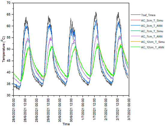 Figure 13 shows an identical temperature distribution at depths of 2 cm, 7 cm, and 12 cm within a 16 cm AC, as obtained from both the ANN prediction and numerical simulations.