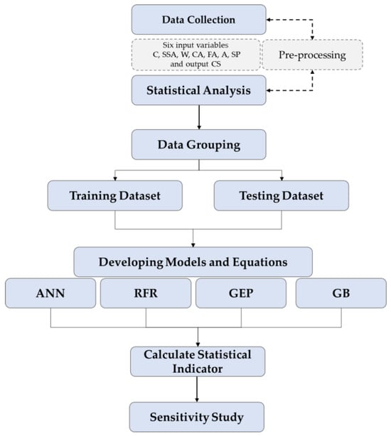 Subsequently, four distinct ML and SCT models, namely an Artificial Neural Network (ANN), Gene Expression Programming (GEP), Random Forest Regression (RFR), and Gradient Boosting (GB), were used to develop their predictive models, using the dataset as input and output. A validation process was then carried out using three statistical metrics to assess the models’ prediction accuracy: coefficient of determination (R2), root mean square error (RMSE), and mean absolute error (MAE). Finally, a sensitivity analysis will be carried out to determine the impact of various factors on the structural properties of steel slag concrete. Figure 1 below showcases the general methodology followed by any ML or SCT model in the form of a flowchart.