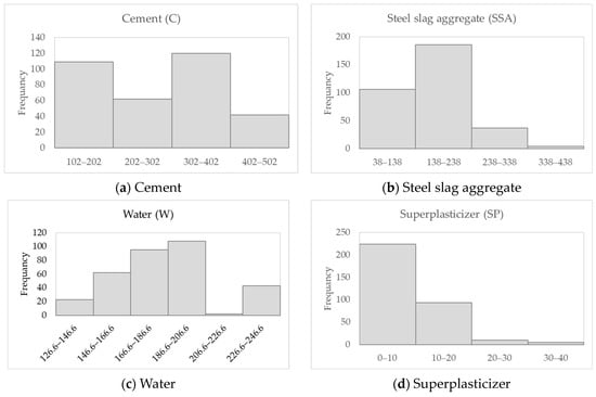 The dataset, comprising 367 samples collected from various literature sources, was designed to ensure a comprehensive and balanced representation of different experimental conditions and concrete mix compositions. The distribution of SSA content within the dataset ranges from 0% to 100% replacement of natural aggregates, capturing both partial and full replacement scenarios. A roughly equal representation of low (0–30%), medium (30–70%), and high (70–100%) SSA-content samples was included, which ensures diverse coverage and enhances the robustness of the predictive models.