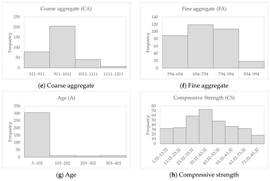 This study evaluated the effectiveness of four different ML and SCT methods. Gene Expression Program (GEP) is the first method; the second is the use of an Artificial Neural Network (ANN), the third is Random Forest Regression (RFR), and the fourth one is Gradient Boosting (GB). Two datasets were created from the acquired data, where 80% (267 observations) were used for model training and the remaining 20% (67 observations) for testing to ensure accuracy. Table 2 and Table 3 present the statistical metrics of the training and testing datasets for the four different models. The statistical measures are the input and output (CS) minimum, maximum, average, and standard deviation. Moreover, Figure 2 showcases the data frequency, while Figure 3 represents the data distribution, where the x-axis represents the variables, and the y-axis represents the compressive strength.