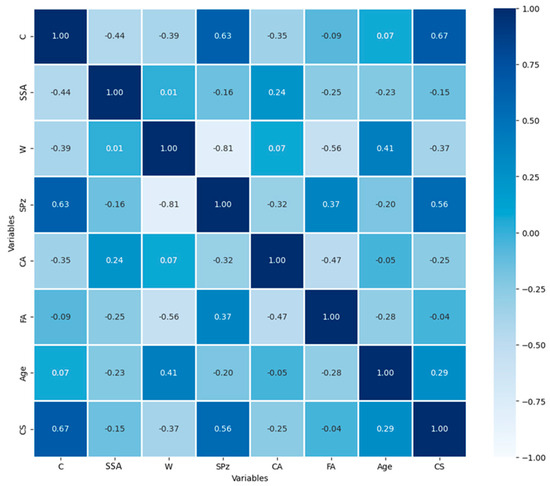 A correlation matrix was generated to examine the relationship between each input variable and the concrete’s CS. The fine aggregate variable was found to have a weaker correlation with CS compared to other variables. While fine aggregate contributes to the overall mix design, its direct impact on the compressive strength was less significant in our dataset, which primarily focused on the effects of SSA.