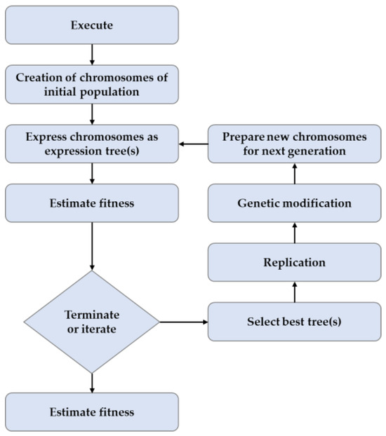Genetic algorithms (GA) are one of the main types of machine learning and SCT; the main principle of this method or technique is based on the Darwinian principle of natural selection to solve complex problems. This method has been used to solve many problems, focusing primarily on optimization problems controlled by various variables [14]. Ferreira [53] proposed an improved form of genetic programming (GP) through the Gene Expression Program (GEP). The GEP works as a learning algorithm focused on understanding relationships between different variables within datasets and creating a model to interpret this relationship. The GEP is a type of GA that finds solutions using a combination of chromosomes and the Tree’s method. These chromosomes have mathematical information or functions encoded into them and are then used to build the first or initial chromosome population. Each chromosome is evaluated by checking its fitness, and the chromosomes with the highest fitness are chosen for reproduction. The genetic operations performed include crossover, mutation, and reproduction. The GA continues to evolve until a satisfactory solution is found. This method produces a relatively simple estimation equation that can be used for practical design and hand calculation [54]. The general methodology of the GEP model can be seen in Figure 6.