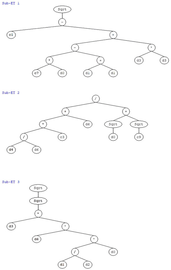 The mathematical equation developed by the GEP model is provided below alongside the expression tree (see Figure 7).