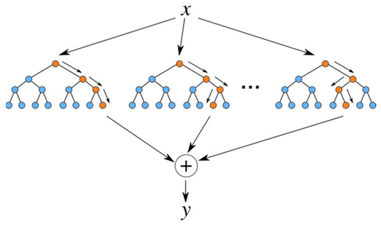 The random forest regression ML method is known for its great ability to handle large sets of data with different attributes and provide a precise or accurate estimation of attribute importance. RFR works on the principle of ensemble learning, combining the predictive power of multiple decision trees to enhance accuracy and reliability. Every tree is made independently on a random subset of the training data, which creates variance and reduces overfitting. Through bootstrap aggregation (bagging), RFR can build a robust model by training on different dataset variations. The final prediction is determined by averaging the predictions from all the individual trees in the forest. This mechanism ensures that the collective decision of many trees is more accurate and stable than any individual tree’s [43]. This process is repeated continuously until the required degree of precision is attained. Overall, the RFR’s unique ability is to enhance its predictive power [55]. The general structure of the RFR model can be seen in Figure 8.