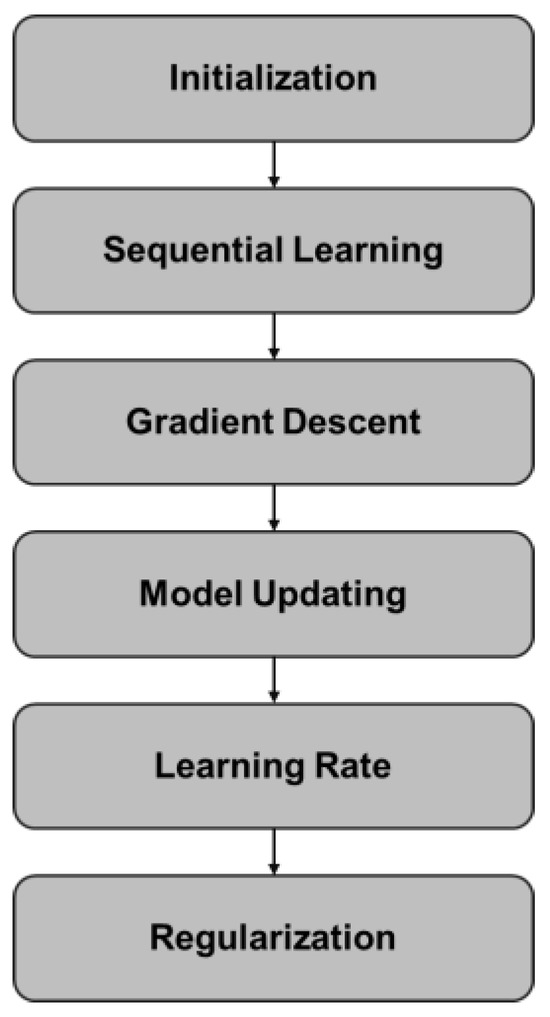 The key concepts and steps in GB, as shown in Figure 9, begin with a simple model to make an initial prediction, such as the mean value for regression tasks. The core of the process involves sequentially adding new models to correct the errors made by the previous ones. Each new model is trained on the residuals, the differences between the actual values, and the predictions from the combined ensemble of earlier models. This correction step is driven by gradient descent, where the new model approximates the negative gradient of the loss function to minimize prediction errors effectively [56].