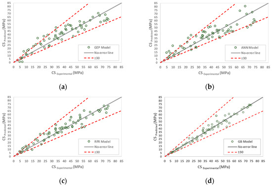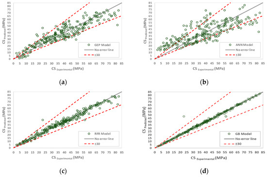 Furthermore, when looking at the R2 values, although the GEP model did not produce the highest value compared to the RFR model, its unique advantage lies in its interpretability. Unlike ANN and RFR, which operate as black-box models, GEP produces a mathematical equation that explicitly describes the relationship between the input variables and the target output. This makes GEP easier to interpret and understand, providing insight into the underlying mechanics that drive the model’s prediction. By producing a clear mathematical expression, researchers and practitioners can gain a deeper understanding of the factors that influence the outcome of the problem. Therefore, despite a lower R2 value compared to GB and RFR, the interpretability offered by the GEP model makes it a valuable tool in scenarios where comprehensibility and transparency are required. However, as shown in Equation (1), it can be seen that the FA variable was not considered, which can be attributed to several reasons, like a limitation in dataset representations, the prioritization of other influential variables, the consideration of the addition of FA unnecessary, the quality of fine aggregate data, and limitations in the model architecture or training processes.