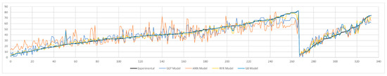For Gene Expression Programming (GEP), the parameters were set as follows: number of chromosomes: 30; head size: 8; number of genes: 3; function set: +, −, ×, /; square root, mutation rate: 0.00138; inversion rate: 0.00346; gene transposition rate: 0.00277; random chromosomes: 0.0026; and gene recombination rate: 0.00277. For the Artificial Neural Network (ANN), parameters such as the learning rate, number of hidden layers, number of neurons per layer, activation functions, and batch size were optimized using grid and random search techniques. For Random Forest Regression (RFR), key parameters like the number of trees, maximum depth, minimum samples split, and minimum sample leaf were tuned through grid search. Similarly, for Gradient Boosting (GB), the learning rate, number of estimators, maximum depth, and minimum sample split were optimized using grid search and random search methodologies.