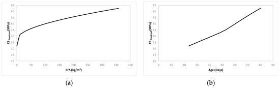 This sensitivity study examined the relationship between the percentage of SSA in concrete mixes and the resulting compressive strength. As mentioned in the literature review and shown in Figure 14a, increasing the SSA content will increase the compressive strength. Moreover, Tarawneh et al. [29] revealed that adding SSA can improve concrete’s abrasion factor, impact value, and compressive strength, particularly during the early stages. Miah et al. [28] showed a notable increase in compressive strength and reduced porosity when steel slag was utilized. Sinha [25] also confirmed the trend by observing an increase in compressive, flexural, and split tensile strengths after replacing fine aggregate with steel slag by a specific percentage.