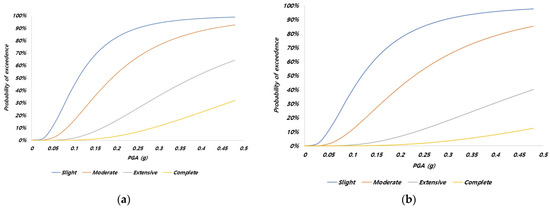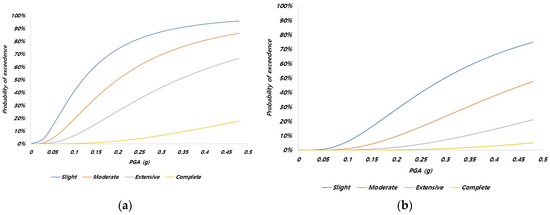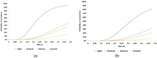 Seismic fragility curves for buildings (Federal Emergency Management Agency, 2022) [11]. (a) Without strengthening and (b) with strengthening.