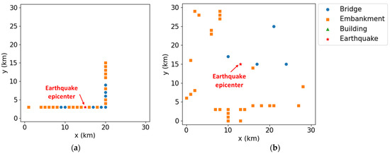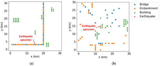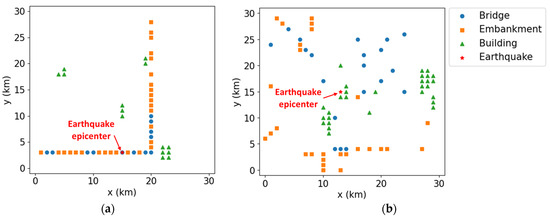 Two earthquake scenarios with different asset placements: (a) Case 1 and (b) Case 2.