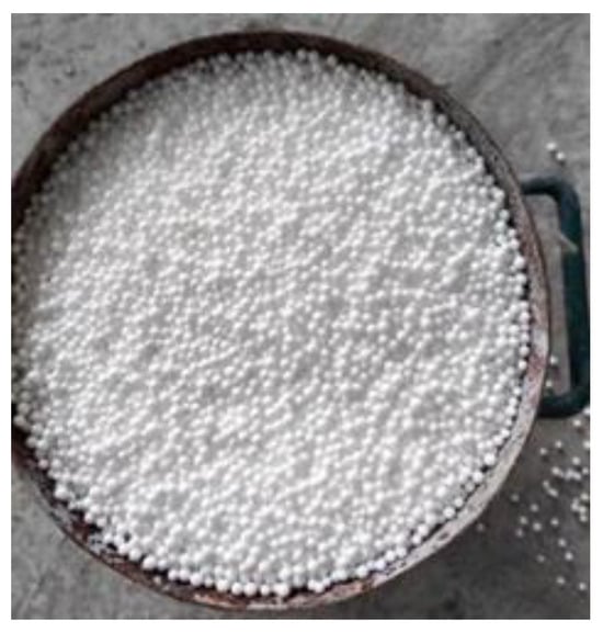 The P.O 42.5 cement produced by Conch Cement Company (Wuhu, Anhui Province, China) was employed for the experiments. The mixing water was Taizhou tap water. The Grade II fly ash from Taizhou Tianda Environmental Protection Building Materials Company (Taizhou, China) was adopted. The water reducer was a polycarboxylate superplasticizer produced by Jiangsu Sobute New Materials Company (Nanjing, China), with a solid content of 20%. The particle size of EPS beads was 2–3 mm, and the bulk density was 17.6 kg/m3. The morphology of the EPS particles is shown in Figure 1.