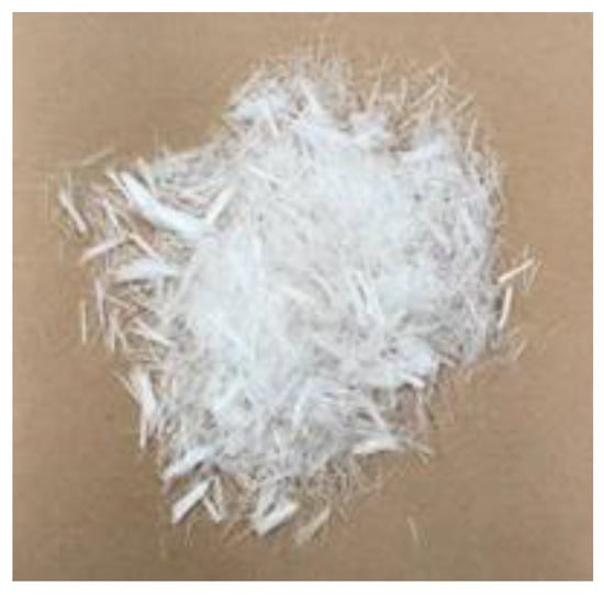 In addition, HTPP fibers can be tightly bonded to the concrete, which enhances its durability, reduces its aging in harsh environments, and improves its load-bearing capacity and seismic performance []. The HTPP fibers have a tensile strength of 750 MPa, a breaking elongation of 14%, a length of 12 mm, and a diameter of 0.15–0.2 mm. Their tensile strength and elastic modulus are 800–1200 MPa and 8–10 GPa, respectively. The morphology of the HTPP fibers is shown in Figure 2.