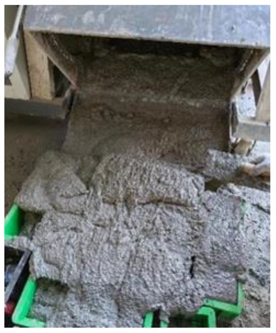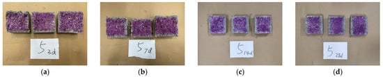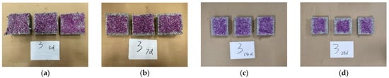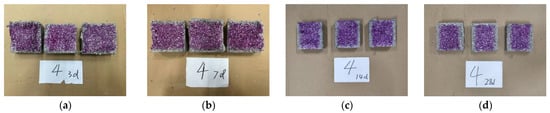Preparation of EPSC specimens was in accordance with the “Standard for Test Methods of Concrete Physical and Mechanical Properties” (GB/T50081-2019) []. Sufficient cubic specimens of 100 mm side length were prepared for each group. At least 12 specimens from each group were tested for carbonation depth at 3, 7, 14, and 28 days, and the strength of another 12 specimens was tested at the same carbonation ages. In addition, three specimens were tested for 28-day strength, while the other three specimens were used for scanning electron microscopy (SEM) analysis. The molded specimens were naturally cured for 1 day, then they were demolded and moved to a standard curing room with the temperature at around 20 °C and the humidity at around 95%. One example of preparation of the samples is illustrated in Figure 3. The dry densities of the five groups of specimens ranged from 1000 to 1100 kg/m3.