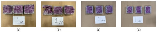 Carbonation of group EP06: (a) 3 days; (b) 7 days; (c) 14 days; (d) 28 days.