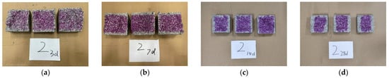Based on the “Standard for Test Methods of Long-term Performance and Durability of Ordinary Concrete” (GB/T50082-2009) [], the specimens were first cured in a standard curing room for 26 days, and then they were baked in a constant temperature and humidity chamber for 2 days. After curing and drying, two opposite sides of each specimen were left waterless, while the other surfaces were sealed with heated paraffin. Parallel lines were drawn on the side surfaces with a pencil at 10 mm intervals to mark the measurement points for the CD. The treated specimens were then placed on iron racks in a carbonation chamber, and the surface distance between the specimens was ensured to be not less than 50 mm. Three specimens were taken from each group at 3, 7, 14, and 28 days of carbonation age, and the residual powder on the fracture surface was scraped off. A 1% phenolphthalein alcohol solution was sprayed on the surface of the specimens, and the CD was measured using a CD gauge with an accuracy of 0.1 mm.