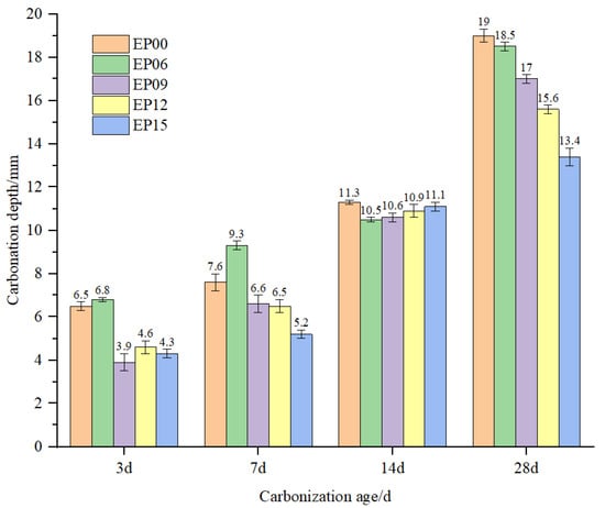 Figure 4, Figure 5, Figure 6, Figure 7 and Figure 8 illustrate the carbonation of the EPSC specimens at 3, 7, 14, and 28 days, while the CDs at these carbonation ages are displayed in Table 2 and Figure 9. Compared with the 7-day carbonation depth, the 14-day CD increased rapidly, with growth rates of 48.7%, 12.9%, 60.6%, 67.7%, and 113.5% for groups EP00, EP06, EP09, EP12, and EP15, respectively. As the carbonation age increased, the CD of the specimens also increased. The 28-day CD of control group EP00 reached 19 mm, which was obviously larger than that of OC.
