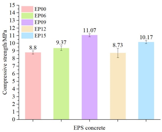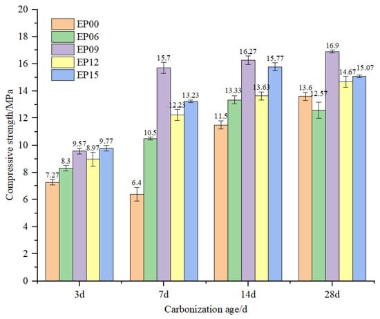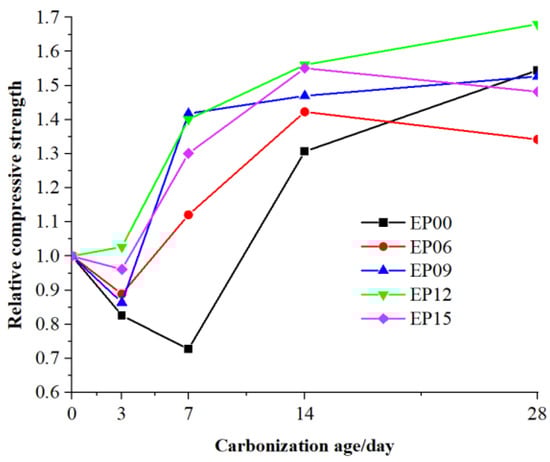 Figure 11 confirmed that the strength of EPSC increased with the increasing carbonation age. This increase was due to the reaction between calcium hydroxide (Ca(OH)2) and carbon dioxide (CO2) in the concrete that generates calcium carbonate (CaCO3) []. Calcium carbonate has a larger volume and density than calcium hydroxide, and the crystals formed can fill the pores in the concrete, thereby increasing its density and strength. The interface between the EPS particles and cement matrix may undergo changes during carbonation. The formation of calcium carbonate can create a transition zone between the EPS particles and cement matrix, improving interfacial bonding and increasing the overall strength of the concrete.