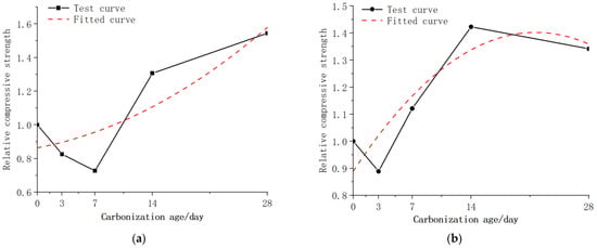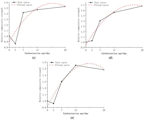 Table 3 shows the relative strength of the EPSC subjected to carbonation, and Figure 12 presents the variation in the relative strength of the EPSC specimens under various carbonation ages. From Table 3, it can be observed that the strength of most specimens increased after carbonation. This is because the CaCO3 produced by carbonation contributes to the increase in the concrete strength. However, in Table 3, the strength of some specimens did not increase but decreased after 3 and 7 days of carbonation. This is mainly due to errors in specimen preparation. In the early stages of the carbonation of the EPS concrete, the carbonation depth is relatively small, resulting in a minor increase in the strength due to carbonation. However, the fluctuations in the EPSC specimen strength caused by specimen preparation errors exceeded the strength increase due to carbonation. Therefore, the strength of a small number of EPC specimens decreased during the early stages of carbonation. To obtain accurate curve equations, a binary function was used to fit the relative strength curves of the EPSC specimens subjected to carbonation, as illustrated in Figure 13. The fitted curves matched well with the experimental curves, and the function model is expressed by Equation (1) []:
