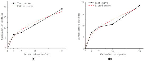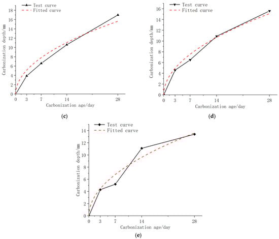 where d denotes the CD, with a unit of mm; t denotes the carbonation time in days; and k denotes the carbonation rate coefficient. The carbonation curves of the EPSC specimens were fitted using Equation (2), and the resulting curves are shown in Figure 14. The carbonation rate coefficients obtained from the fitted curves are presented in Table 5.