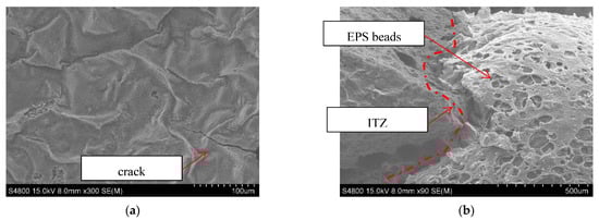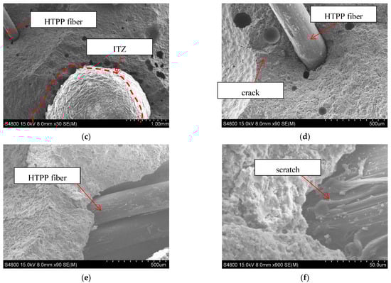 Figure 15 shows the SEM images of the internal structure of the EPSC specimens. Figure 15a,b depict the EPSC without HTPP fibers, while Figure 15c–f present the EPSC with HTPP fibers. A comparison of Figure 15a,d revealed that the cracks in the EPSC with HTPP fibers were smaller, whereas the cracks in the EPSC without HTPP fibers were wider. This indicated that HTPP fibers reduced the formation and propagation of cracks. It was observed from Figure 15b that the interfacial transition zone of the EPSC without HTPP fibers was relatively loose. In contrast, Figure 15c showed that the EPS particles in the HTPP fiber-reinforced EPSC were compressed, resulting in a denser interfacial transition zone, which increased the density and reduced the porosity of the concrete, thereby improving the CR. The high elastic modulus of HTPP fibers allows them to dramatically improve the tensile and flexural strengths of EPSC under external loads, indirectly improving its CR. Figure 15e revealed that the fibers were present in short bundles or dispersed in the concrete. When the concrete is subjected to external stress, the fibers can absorb some of the tensile stress to prevent the formation and propagation of cracks, thus reducing the risk of carbonation. Figure 15f demonstrated numerous scratches on the surface of the HTPP fibers, indicating a strong bond between the fibers and the cement matrix, which is able to absorb more energy under stress and reduce the formation and propagation of microcracks.