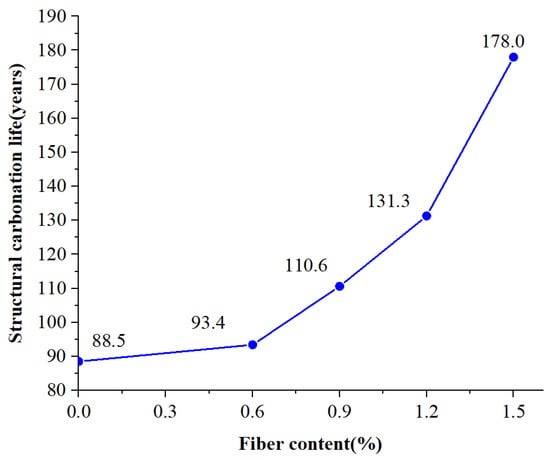 Figure 16 illustrates the predicted carbonation service life of HTPP fiber-reinforced EPSC components under accelerated carbonation test conditions, with the fiber volume content increasing from 0% to 1.5%. Furthermore, the carbonation service life of EPSC containing HTPP fibers increased significantly, and the EPSC containing 1.5% HTPP fibers showed the highest increase of about 101.1% in the carbonation service life. This demonstrated that adding HTPP fibers to EPSC can better protect steel reinforcement, significantly extending its carbonation service life and enhancing its durability.