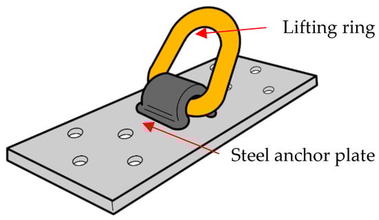 As shown in Figure 3, a novel rigging device was developed for prefabricated wood I-joist floor panels and other lightweight wood panels, including structural insulated panels. The device consists of a steel anchor plate (a custom-made steel plate) and a lifting ring welded to the plate. The plate has eight predrilled holes to accommodate eight STSs. The screw pattern is designed to fit the flange of the I-joist and maximize the grip of the screws, even if the plate is incorrectly installed on the construction site. Detailed dimensions of the anchor plate can be found in Figure 4. The versatile device offers a high degree of flexibility in terms of allowable capacity, which can be expanded by increasing the number of screws. For simplicity, two screw arrangements are recommended: four screws in the middle and eight screws. The rigging device is designed to be compatible with 6 mm diameter STSs.
