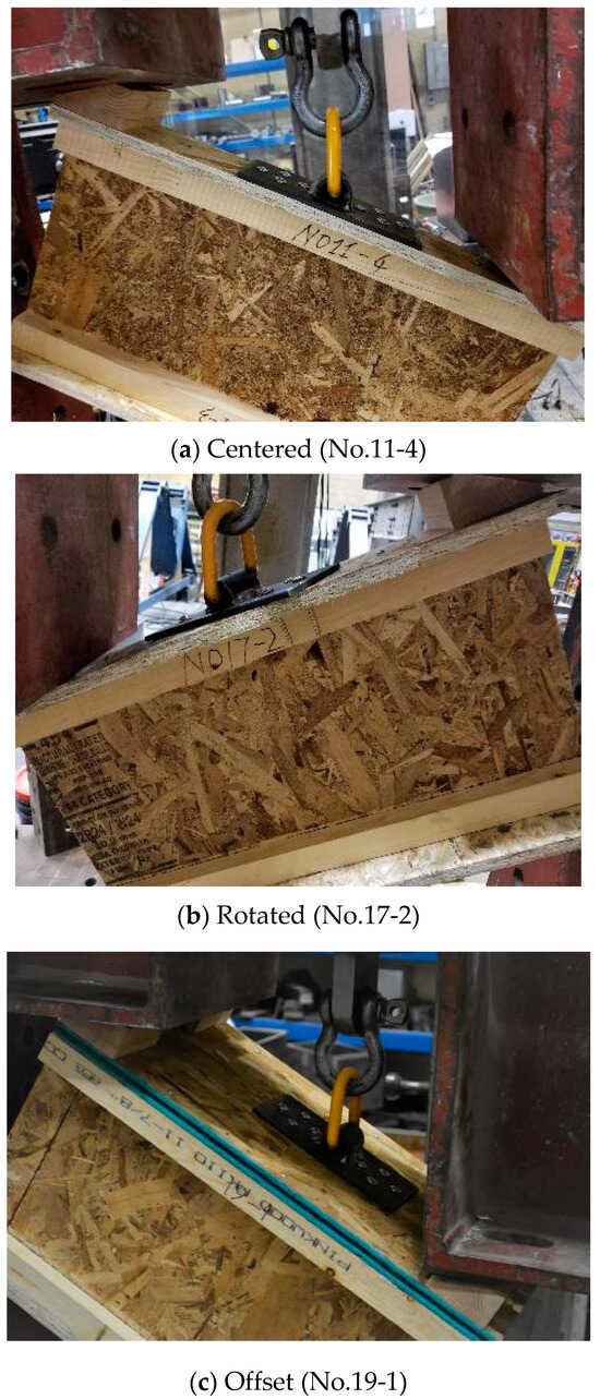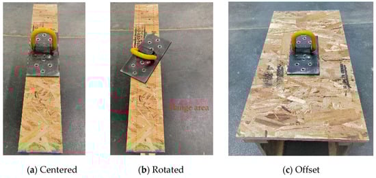 Test specimens were fabricated by fastening two oriented strand board (OSB) strips (i.e., sheathing panel) to the top and bottom flanges of wood I-joists using nails, creating symmetric specimens. A pair of rigging devices was used repeatedly in the withdrawal tests. The anchor plate of the rigging device was connected to the OSB and I-joist flanges using STSs. To cover various construction scenarios during the lifting process, three anchor plate placements were considered, as illustrated in Figure 5: (a) centered on the flange of the I-joist; (b) with a 30° rotation and only half of the STSs in the flange; and (c) offset from joist flanges with all STSs into the sheathing panel only. Note that centered placement (Figure 5a) is often the preferred placement. The rotated and offset placements (Figure 5b and Figure 6c) were included in the project to indicate alternative on-site installation methods. The OSB strips were 609 mm (24 in) in length. Four different widths of OSB strips/panels were used, namely 76 mm (3 in), 100 mm (4 in), 152 mm (6 in), and 305 mm (12 in). In particular, the 305 mm OSB panels were used for specimens with the offset placement (Figure 5c).