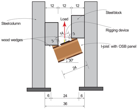 The test frame was built by using two steel columns and two adjustable steel blocks, as shown in Figure 6. The test specimen was secured at the bottom of the steel blocks, which were attached to the steel columns. The adjustable steel blocks allowed for the creation of different angles for specimen installation. A withdrawal angle of 90 degrees (perpendicular to the specimen surface) exhibits the maximum withdrawal capacity, which decreases with any reduction in angle. In the rigging practice, the sling-to-panel angle is typically restricted to be larger than 60 degrees. Therefore, the withdrawal angle was set to 60 degrees for conservative purposes. Two wood wedges were attached to the OSB strips to maintain a 60-degree angle to the sheathing surface during the withdrawal tests. Figure 6 shows the schematic details of the setup. Actual test setups for three anchor placements are illustrated in Figure 7.