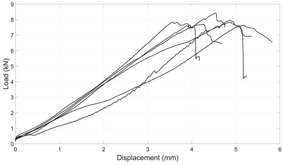 During the tests, displacement measurements were obtained from the actuator’s displacement, while loads were recorded using the actuator’s load cell. Typical load–displacement curves are presented in Figure 8. The average MC for LVL and SSL flanges were approximately 8% and 9%, respectively.