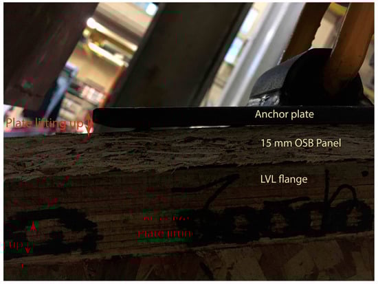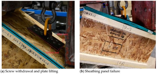 The test results for the No. 19 specimens with offset anchor plates, which were only screwed to OSB panels, are shown in Table 5. Two failure modes were observed, as illustrated in Figure 12: screw withdrawal and plate lifting and OSB panel failure. Table 5 indicates that, although the anchor plate was only screwed into the OSB panel, their withdrawal capacities did not significantly reduce. Direct fastening into OSB (No. 19 specimens) still retained about half or two-thirds of the capacity of the No. 15 and 16 specimens, where all eight screws were threaded into the wood I-joist flange.