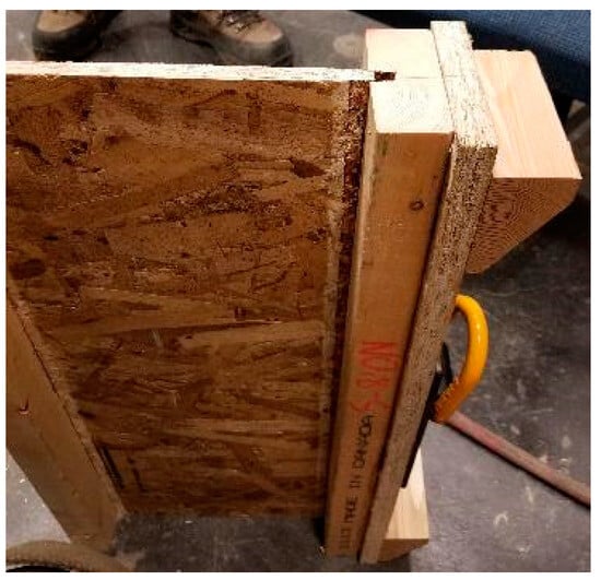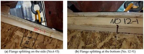 It should be noted that an unexpected failure occurred in specimen No. 8#5 (marked in red in Table 4). In this test, the I-joist flange was pulled out as shown in Figure 11. This failure may have been caused by the bottom flange touching the testing frame and being restrained from moving during the withdrawal test or by a manufacturing defect in the wood I-joist, such as insufficient glue between the flange and the web.