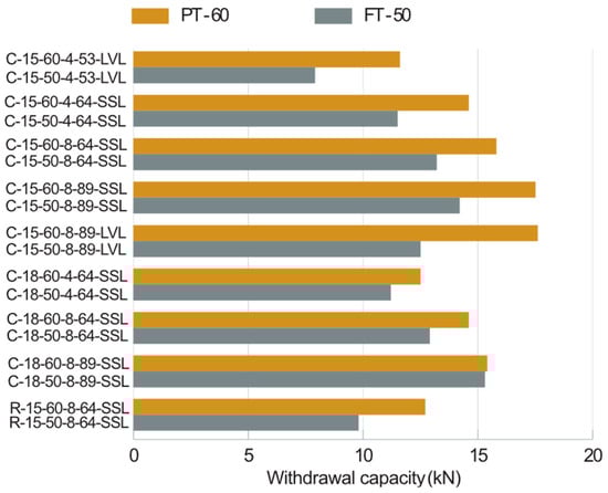 Two screw types were employed in the withdrawal tests: PT-60 and FT-50. Although the PT-60 screw is partially threaded with a shorter thread length (37 mm) compared to the FT-50 (45 mm), PT-60 screws consistently exhibited higher withdrawal capacity than that of FT-50 screws, as shown in Table 6 and Figure 13. This may be because the penetration thread length of the PT-60 in the I-joist flange is longer than that of the FT-50.