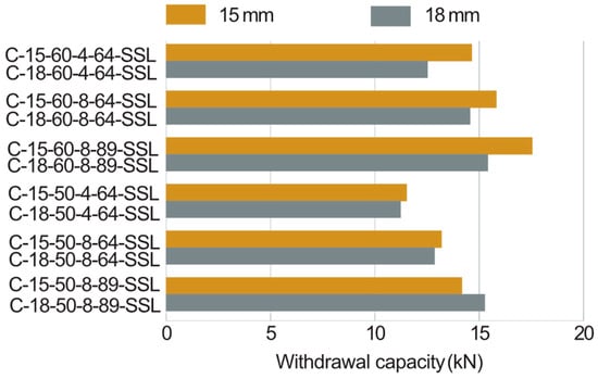Table 9 and Figure 16 demonstrate that I-joist specimens with wider SSL flanges (89 mm) exhibited higher withdrawal capacities compared to those with narrower SSL flanges (64 mm). This enhancement is likely attributed to the increased distance between the flange edges and screw locations.