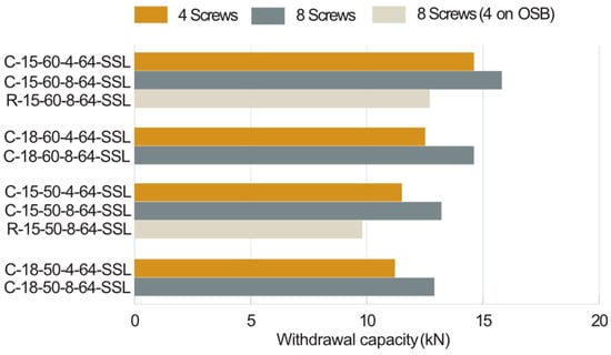 This section discusses the influence of screw types and quantities, OSB thickness, and joist flange material and width on the withdrawal capacity.