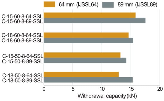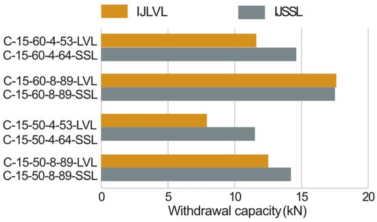 As illustrated in Table 10 and Figure 17, comparisons of the withdrawal capacity between IJLVL and IJSSL specimens show that those with the SSL flange exhibit higher withdrawal capacity than those with the LVL flange. A significant increase in more than 20% was observed for C-15-60-4-64-SSL compared to C-15-60-4-53-LVL and for C-15-50-4-64-SSL to C-15-50-4-53-LVL specimens. While the wider flange width contributes to capacity increase, as discussed in the preceding section, this effect was less than 20% as shown in Table 9. Therefore, it can be concluded that the SSL flange specimens exhibit higher withdrawal capacity compared to the LVL flange specimens.