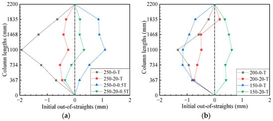 Initial out-of-straight of pre-cast CSSCs: (a) 250 mm; (b) 200 mm and 150 mm.