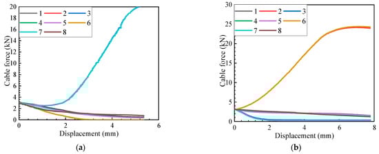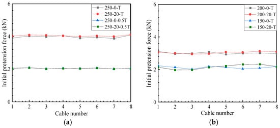 Measured initial pretension forces of the cables: (a) 250 mm; (b) 200 mm and 150 mm.