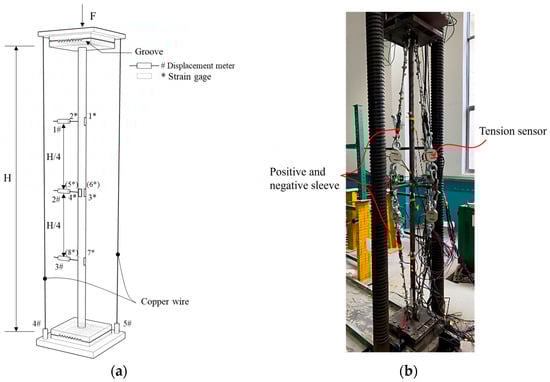 Steel column loading scheme: (a) layout of the measuring points; (b) test setup.