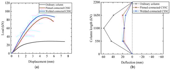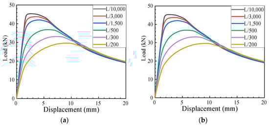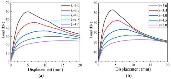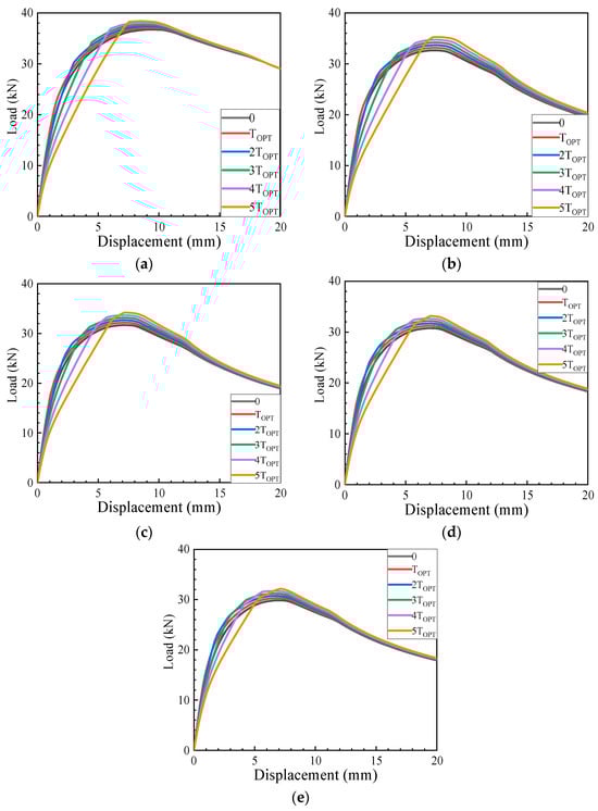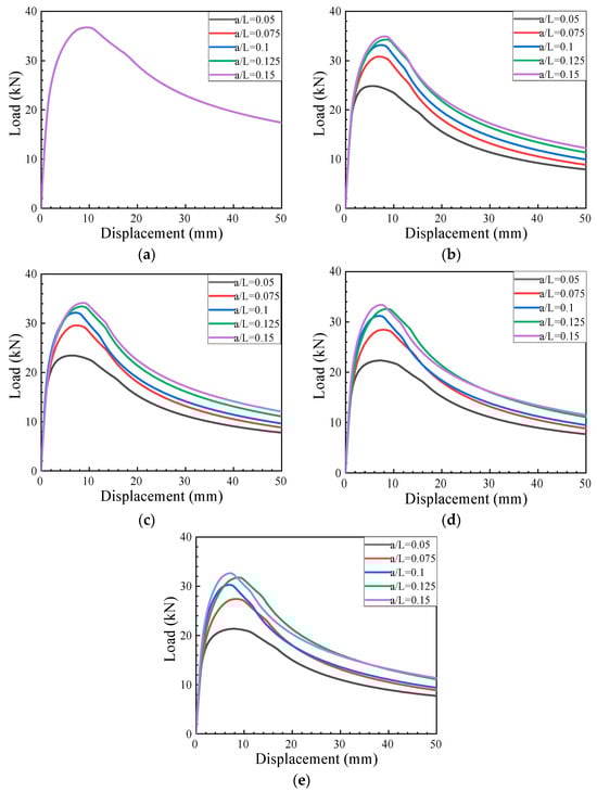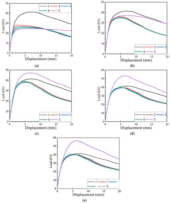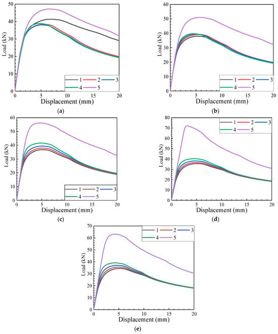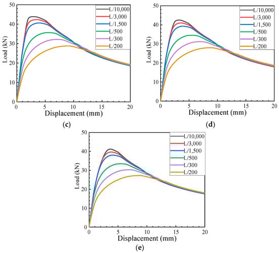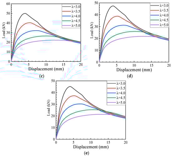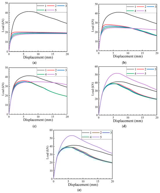 Load–displacement curves of the columns for different cross-arm lengths: (a) ; (b) ; (c) ; (d) ; (e) .