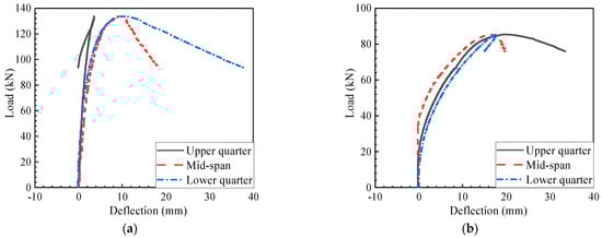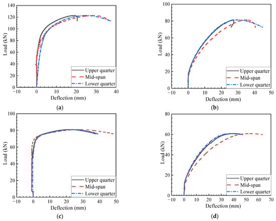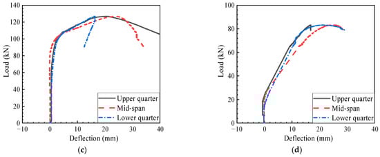 Load–deflection curves of the pre-cast CSSCs: (a) 200-0-T; (b) 200-20-T; (c) 150-0-T; (d) 150-20-T.