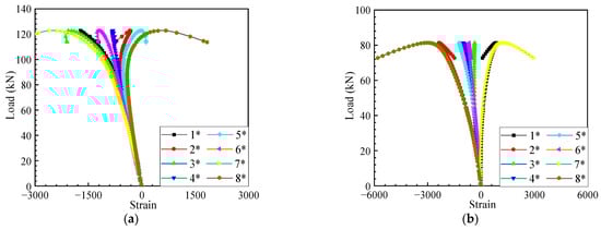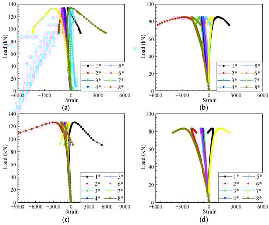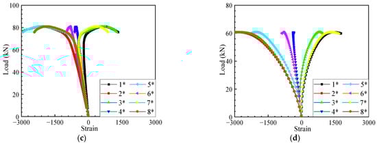 Load–strain curves for different points on the columns: (a) 250-0-T; (b) 250-20-T; (c) 250-0-0.5T; (d) 250-20-0.5T.