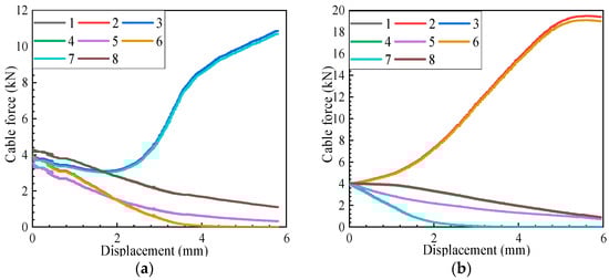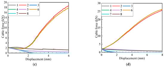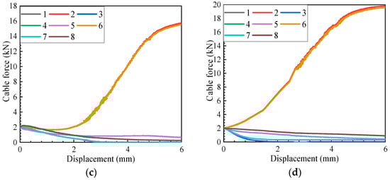 Cable force–displacement curves of the main column: (a) 250-0-T; (b) 250-20-T; (c) 250-0-0.5T; (d) 250-20-0.5T.