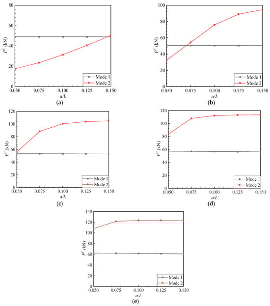 Changes in linear buckling loads () with changes in the cross-arm length for different cable diameters: (a) ; (b) ; (c) ; (d) ; (e) .